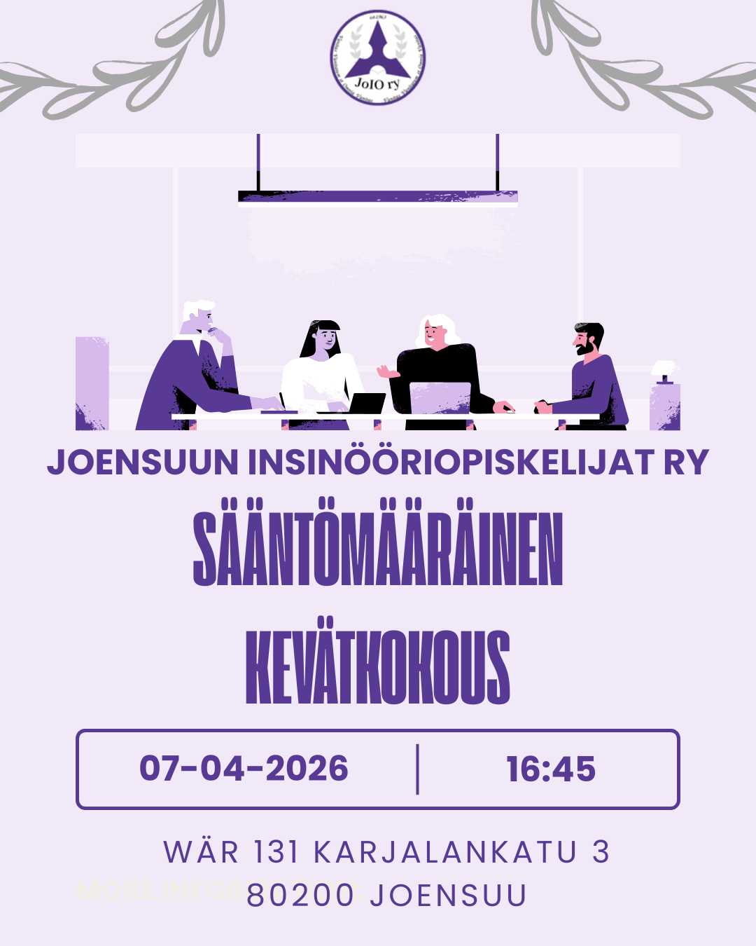 Yhdistyksen sääntömääräinen kevätkokous järjestetään 7.4.2025 klo 16:45 Wärtsilä kampuksella pikku auditoriossa WÄR_131, osoitteessa Karjalankatu 3, 80200 Joensuu. Kokous on avoin kaikille yhdistyksen…