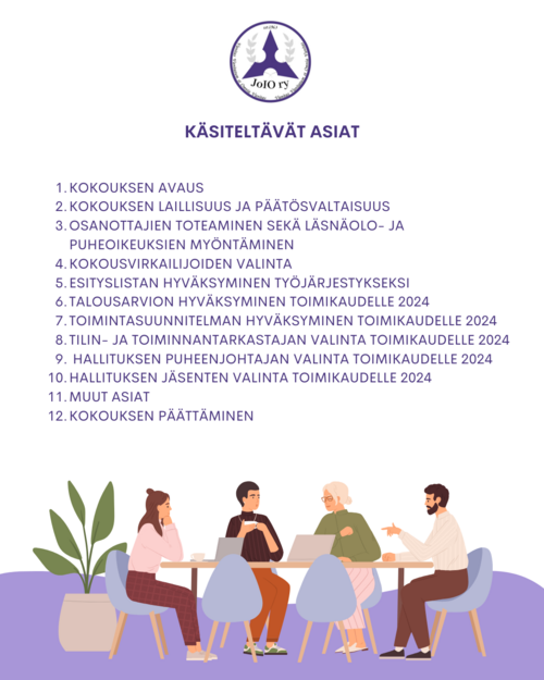 Kutsu on kaikille JoIO ry:n jäsenille. Tule mukaan vaikuttamaan järjestön tulevaisuuteen sekä verkostoitumaan! Päätettävinä asioina mm. 2024 hallitus ja toimintasuunnitelma.